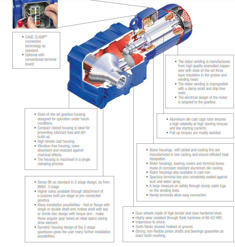 BG 系列減速電機(jī)是我們最暢銷和最經(jīng)濟(jì)合算的產(chǎn)品,為可靠性與經(jīng)濟(jì)性樹立了新標(biāo)準(zhǔn),其中包括諸多無與倫比的標(biāo)準(zhǔn)功能與特點(diǎn)。逆變器友好型設(shè)計(jì)不僅可確保目前輕松集成,而且還能滿足未來需求。標(biāo)配有確保與您的應(yīng)用輕松集成的英制或公制尺寸輸出軸。BG 減速電機(jī)擁有靈活的安裝選件,包括支腳、基座、表面與法蘭解決方案。電機(jī)接線盒可以安裝在圍繞電機(jī)架旋轉(zhuǎn) 90° 的其他位置,實(shí)現(xiàn)無與倫比的集成可能性。