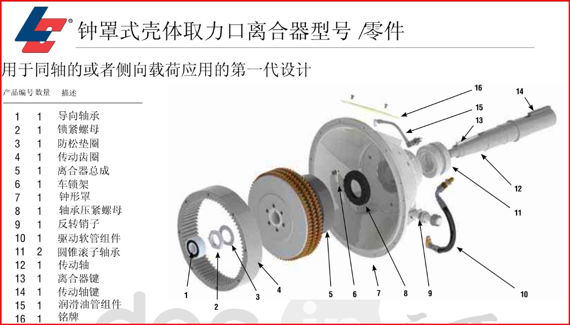 Logan氣/液驅(qū)動 鐘罩式殼體取力口離合器式自調(diào)節(jié)的,設計成直接安裝到柴油發(fā)動機或者汽油發(fā)動機的飛輪上。摩擦圓盤組為干式應用設計。通過一個固定的缸套-活塞布置或者通過內(nèi)置軸和離合器油道來完成。離合器的傳動軸通過內(nèi)孔或鍵槽來安裝。扭矩從盤片組傳遞到安裝在發(fā)動機飛輪上的齒輪傳動齒圈上。Logan離合器主杠加壓, 推動活塞夾緊或鎖住摩擦片或分離鋼片。當壓力移走, 回位彈簧使摩擦片和鋼片分離, 當鋼片和摩擦片分離后, 可以保持運行間隙。